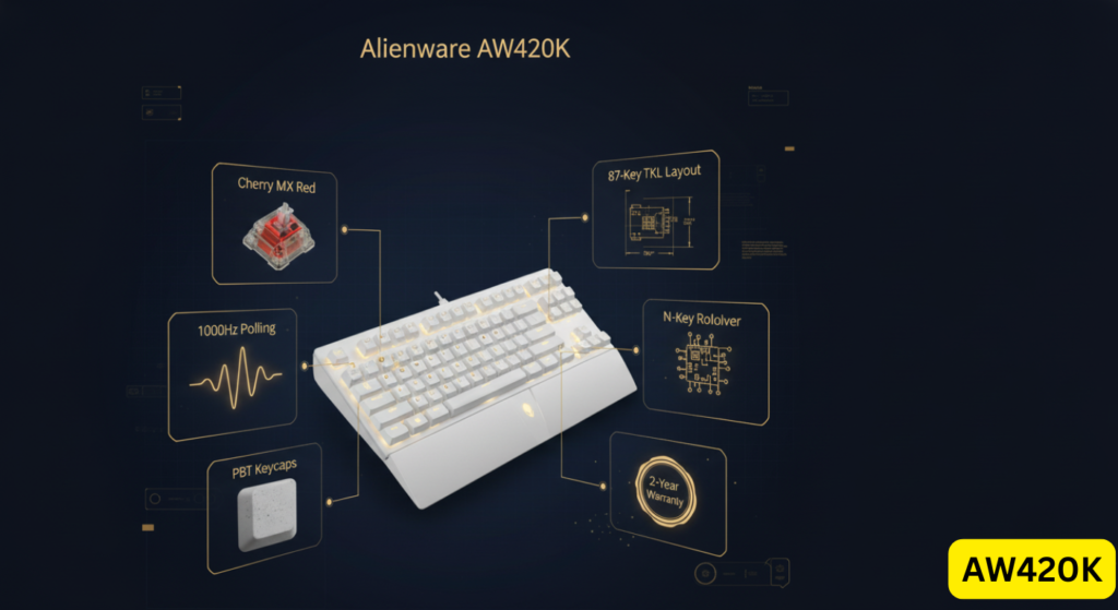 The Alienware AW420K is Alienware’s first dedicated tenkeyless (TKL) mechanical gaming keyboard, designed for gamers who need desk space without sacrificing performance. Released in late 2022 and still available in 2025, it features: