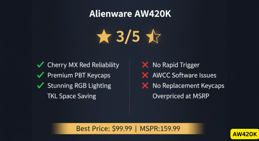 The Alienware Tenkeyless Gaming Keyboard AW420K is a solidly built mechanical TKL keyboard with Cherry MX Red switches, customizable RGB lighting, and premium PBT keycaps. However, at $149.99 MSRP, it faces fierce competition from keyboards offering hot-swappable switches, Rapid Trigger technology, and better acoustics.