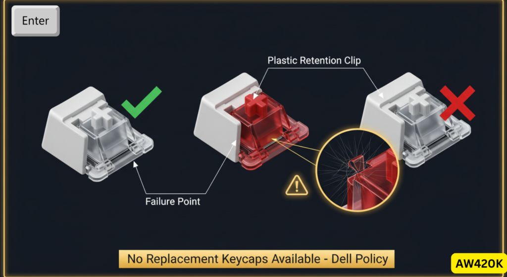Risk Assessment: Low to moderate. While the AW420K may share design elements with problematic models, insufficient verified information exists to confirm identical failure rates. Exercise normal care with keycap removal.