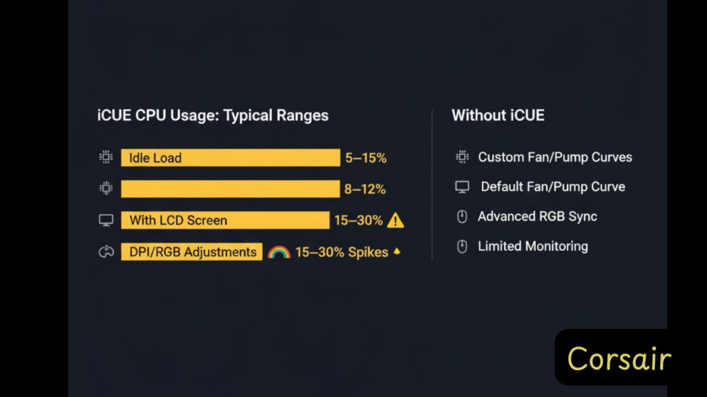- iCUE dependency: Mandatory for full control, consumes 5-30% CPU resources