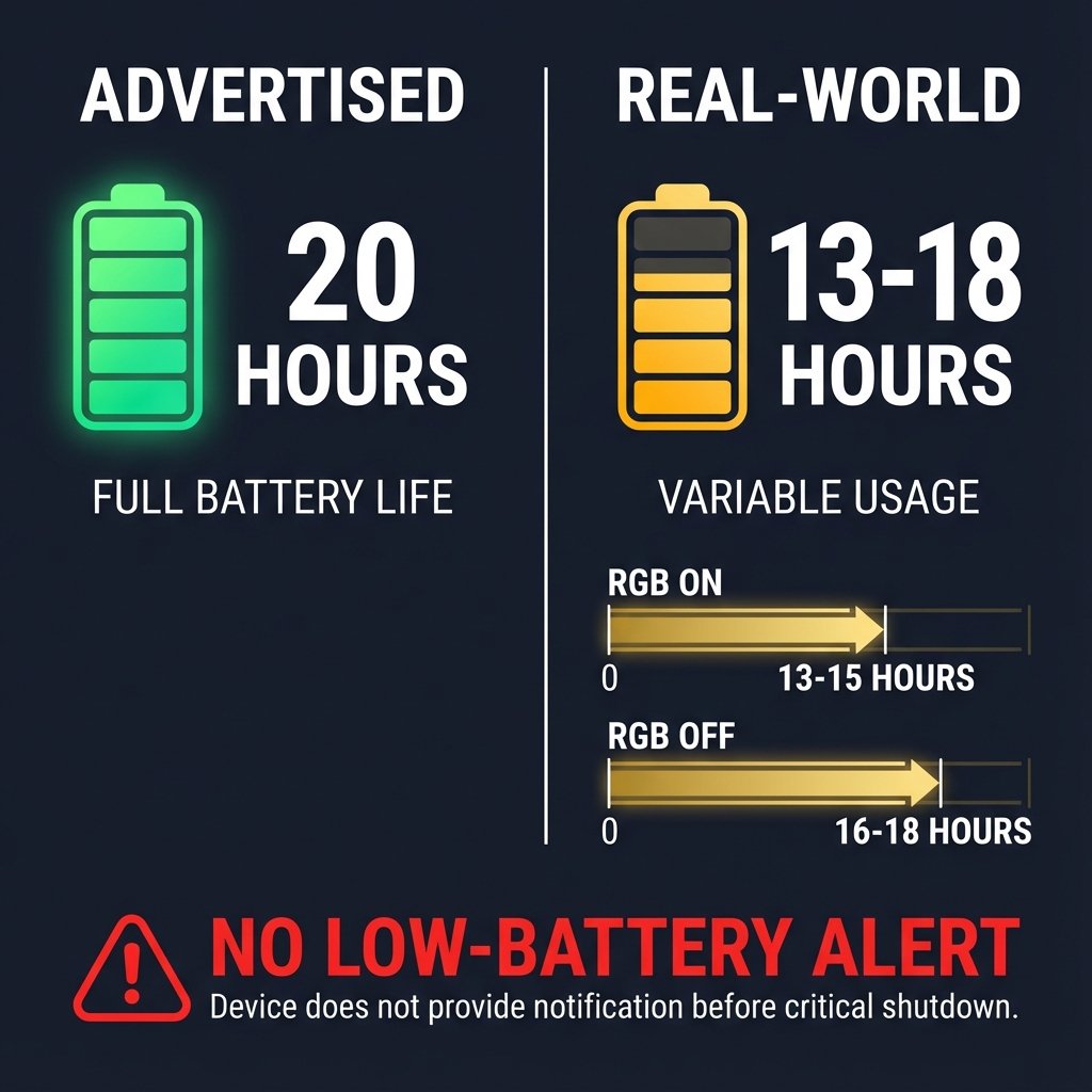 | 20 hours | 13-18 hours (RGB on: 13-15hrs; RGB off: 16-18hrs) | 8-10 hours (likely degraded batteries) |