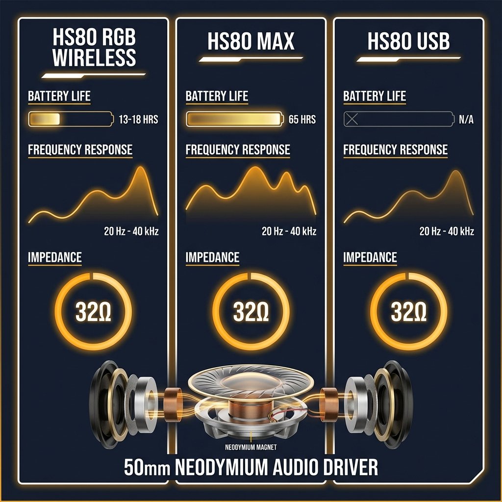 HS80 RGB Wireless: 12-15 hours (not 20). HS80 Max: 65-130 hours (accurate).