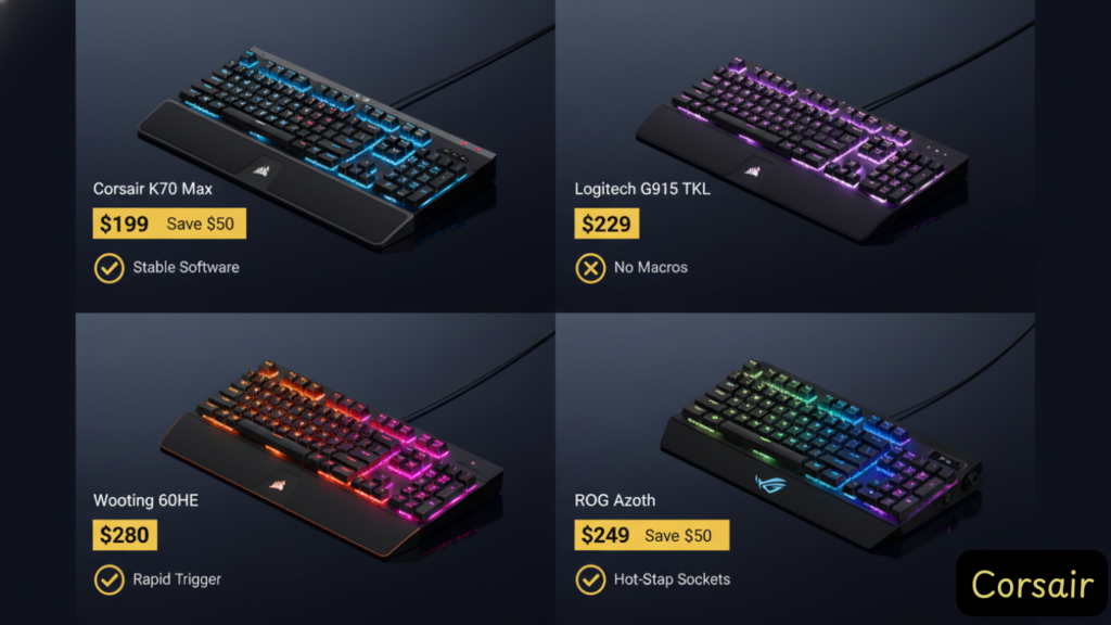 Blunt assessment: In 2025, the K100 RGB’s soldered switches and iCUE instability make it less competitive. Wooting dominates for gaming performance, ASUS wins for versatility, and the K100 only makes sense if you’re locked into the Corsair ecosystem or need those specific macro keys.