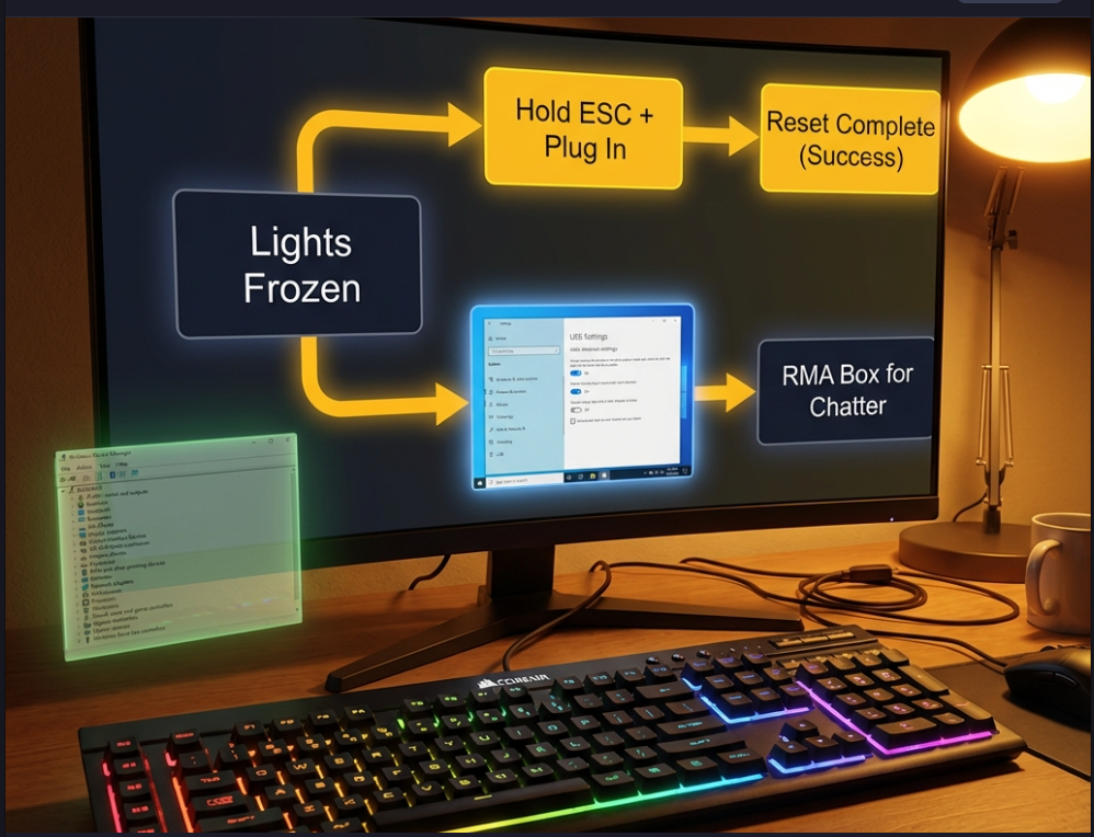 Symptoms: Keyboard types but no RGB, or lights stuck on rainbow.