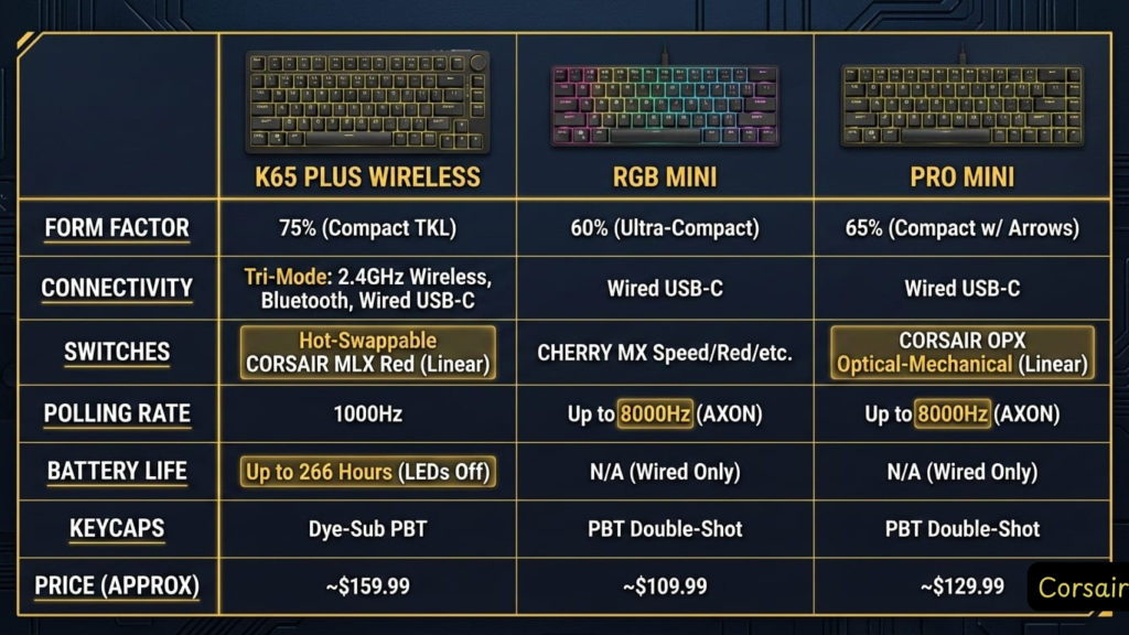 Comprehensive review of the entire Corsair K65 lineup—K65 Plus Wireless, K65 RGB Mini, K65 Pro Mini, and legacy models. Real-world testing, honest user reviews, critical firmware warnings, and which variant is actually worth your money.