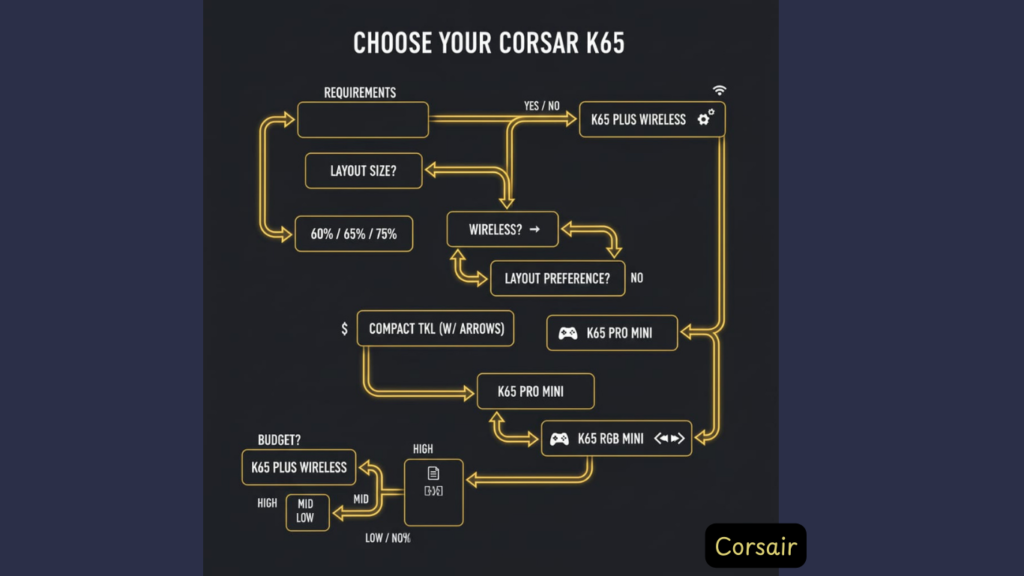 The Corsair K65 series encompasses multiple compact mechanical gaming keyboards spanning several years and form factors. This review covers the current lineup (K65 Plus Wireless, K65 RGB Mini, K65 Pro Mini) plus context on legacy models (K65 Rapidfire, K65 Lux RGB, K65 Vengeance) to help you understand the entire product family.