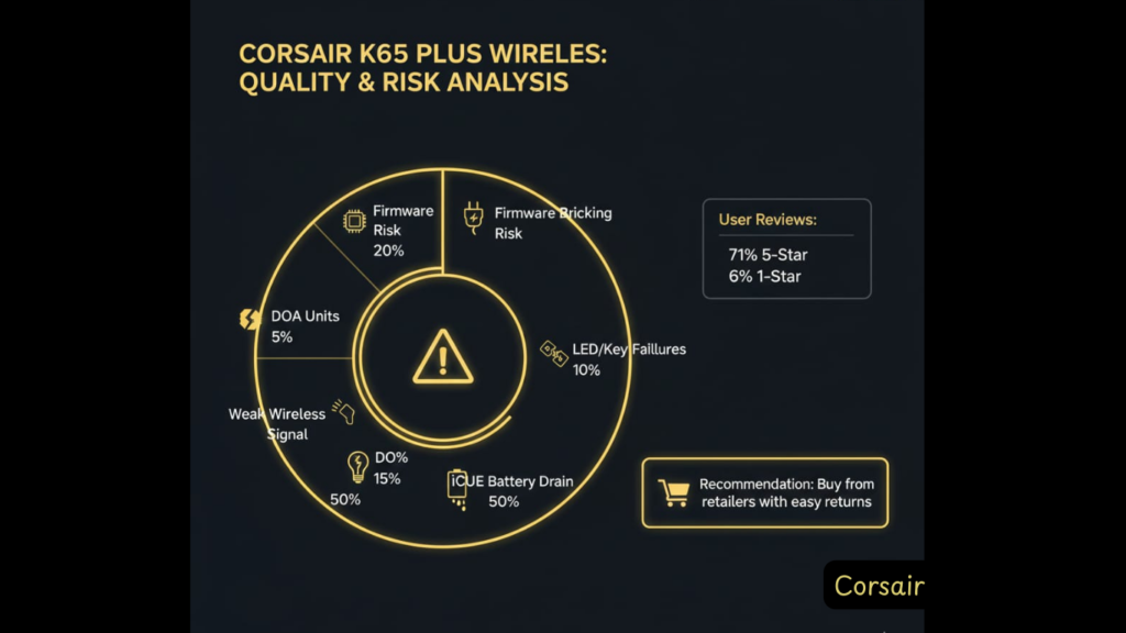 Based on Amazon data: 71% give 5 stars, 14% give 4 stars (85% satisfied), but 6% give 1 star. That 6% failure rate is higher than typical for premium keyboards. Common failure modes: bricked firmware, dead keys, LED malfunctions, weak wireless signal. The good news: Most units work great. The bad news: If you get a lemon, it’s a hassle. Solution: Buy from retailers with easy returns, test immediately, and avoid firmware updates.