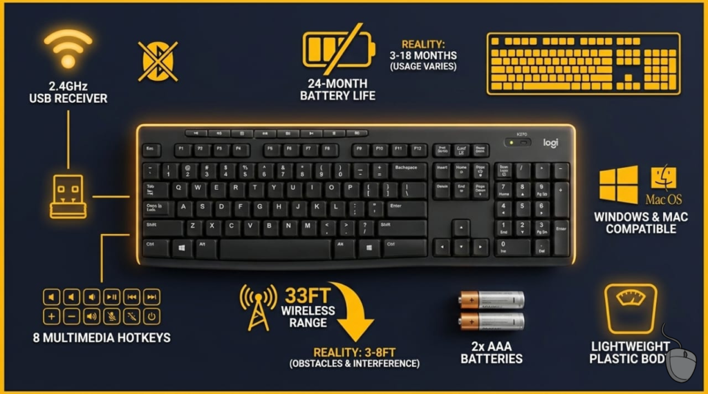 The Logitech K270 (also called Logitech wireless keyboard K270 or keyboard Logitech K270) is a budget full-size wireless keyboard using 2.4 GHz connectivity (NOT Bluetooth) with a USB nano receiver. Launched years ago and largely unchanged, it remains one of Amazon’s best-selling keyboards due to its rock-bottom price point ($20-30) and simple plug-and-play design.