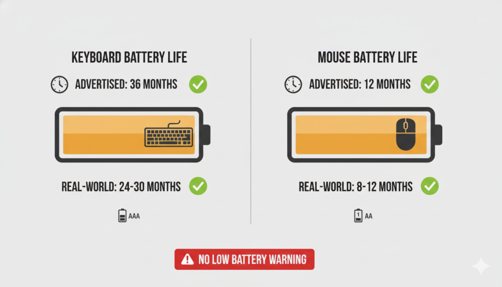 Advertised: 36 months (keyboard, 2x AAA alkaline), 12 months (mouse, 1x AA alkaline). Real-world: 24-30 months keyboard, 8-12 months mouse with moderate daily use (4-6 hours/day). Heavy users report 18-24 months keyboard, 6-8 months mouse. Battery life depends on auto-sleep settings and whether on/off switches are used when idle.
