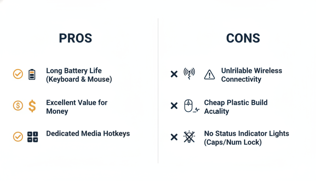 However, frequent 2.4GHz connectivity dropout issues (especially with USB 3.0 ports and crowded RF environments), cheap plastic build quality with noticeable keyboard flex, and mushy membrane dome switches that deteriorate over time mean this combo should not be your first choice if you can afford to spend $50-100 on better alternatives like the Logitech K800 Illuminated ($79.99 — backlit, rechargeable), Corsair K57 Wireless ($69.99 — gaming-focused with RGB), or Corsair K55 RGB ($49.99 — budget gaming).