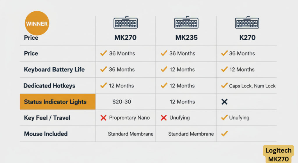 The main differences: MK270 has 8 dedicated hotkeys (MK235 uses Fn combinations), MK270 includes Caps Lock indicator (MK235 doesn’t), MK270 uses a proprietary nano receiver (MK235 also uses a proprietary nano receiver), and MK270 has slightly deeper key travel (1.8mm vs 1.3mm) for better typing feel.